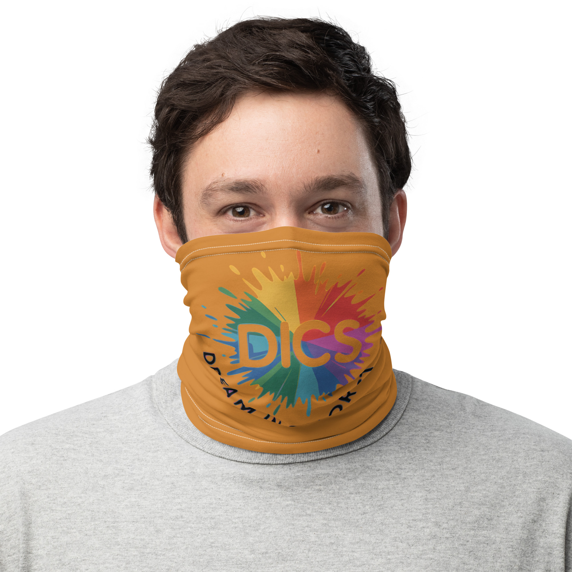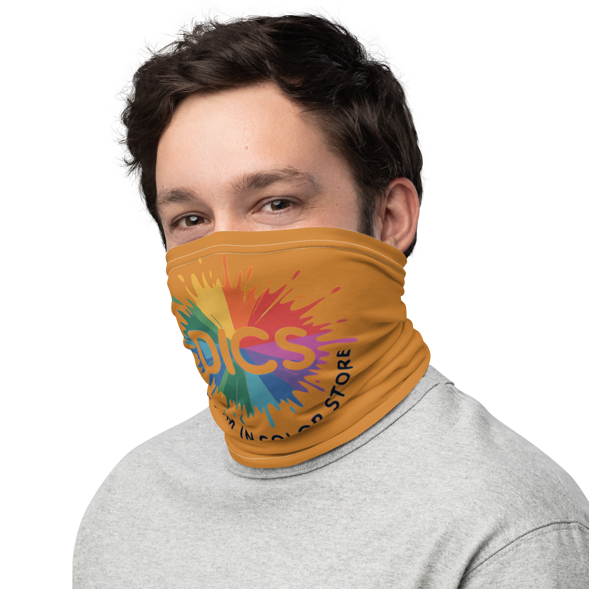 The Dream In Color Store has a look — vibrant, bold, unapologetically colorful — and the DICS gaiter brings that identity straight to your face. The signature rainbow burst DICS logo blazes across a rich mustard background, making this one of the most recognizable pieces in the collection. Wear it as a gaiter, pull it up as a face covering, fold it as a headband, or wear it as a neck warmer. Soft, stretchy, and built for all-day wear. This is what it looks like when you wear your colors proudly. $18. dreamincolor.store
