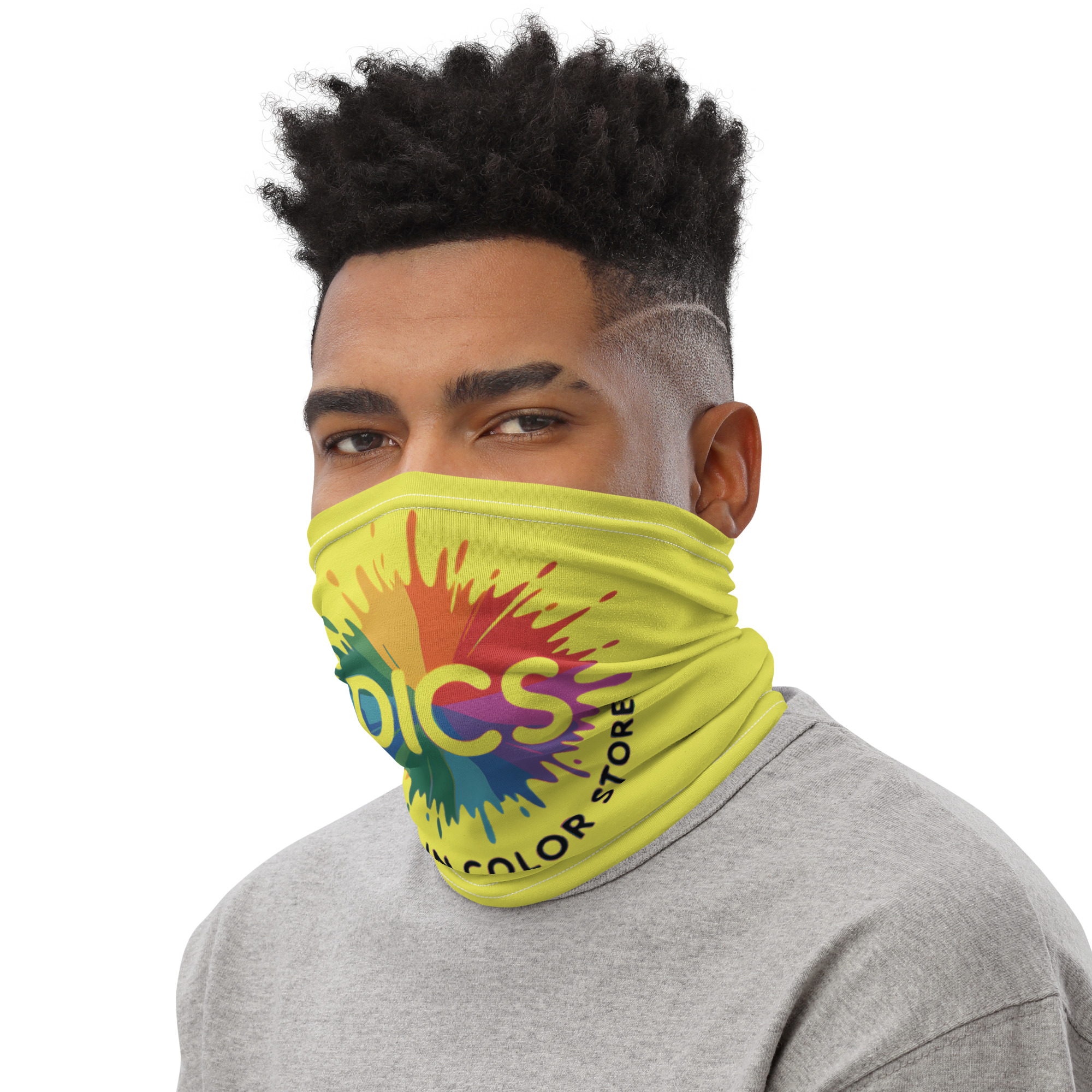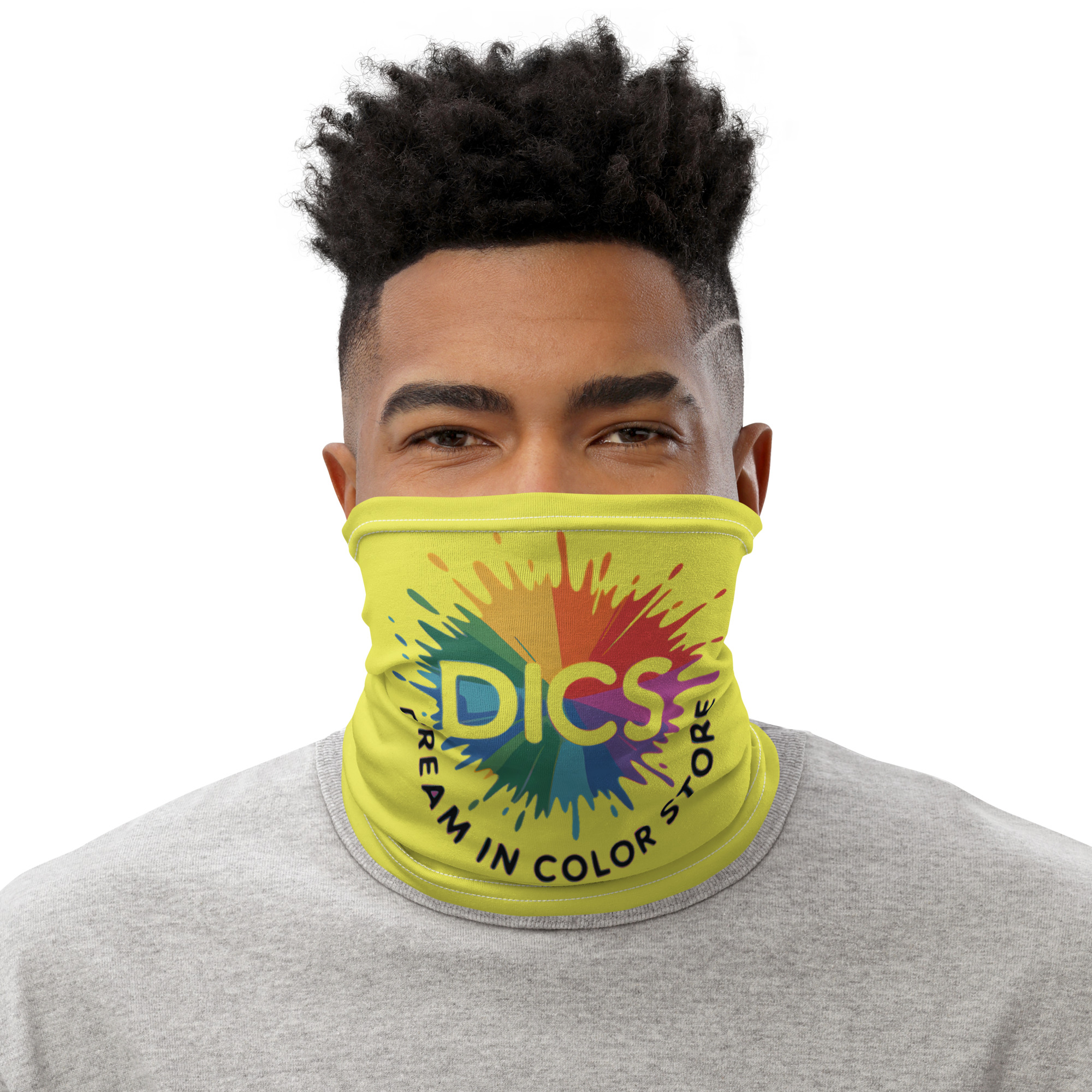 The Dream In Color Store has a look — vibrant, bold, unapologetically colorful — and the DICS gaiter brings that identity straight to your face. The signature rainbow burst DICS logo blazes across a rich yellow background, making this one of the most recognizable pieces in the collection. Wear it as a gaiter, pull it up as a face covering, fold it as a headband, or wear it as a neck warmer. Soft, stretchy, and built for all-day wear. This is what it looks like when you wear your colors proudly. $18. dreamincolor.store