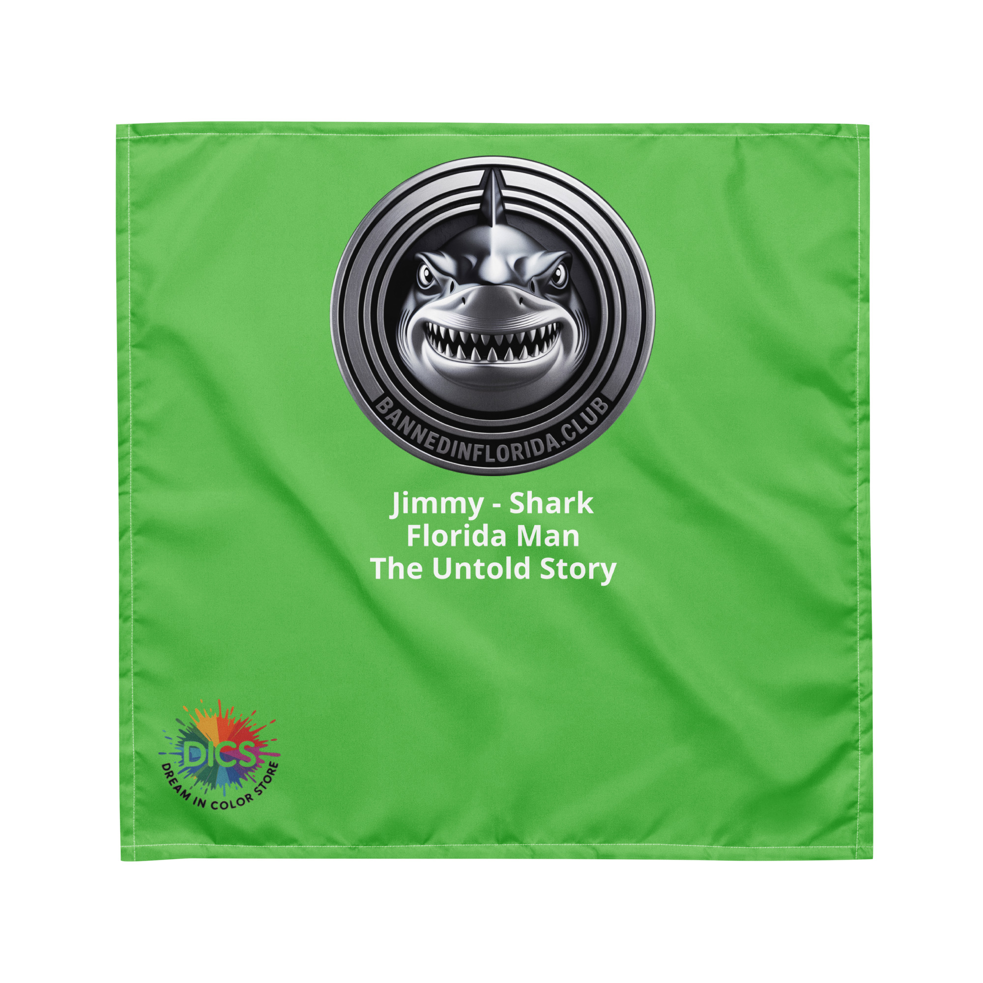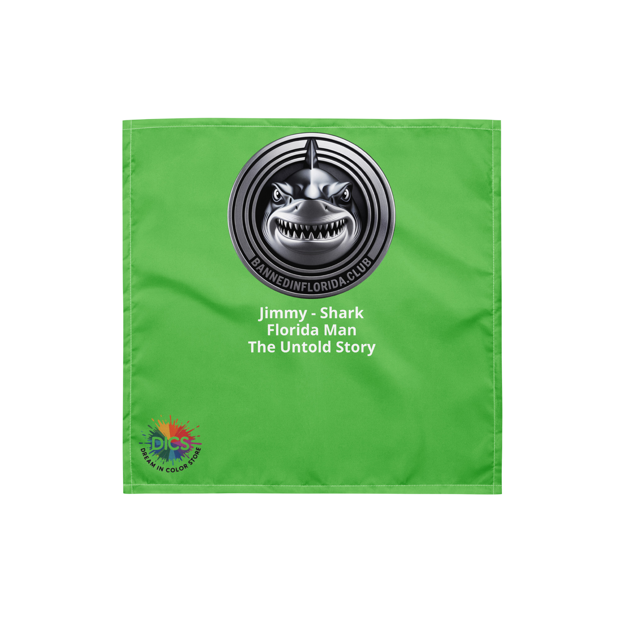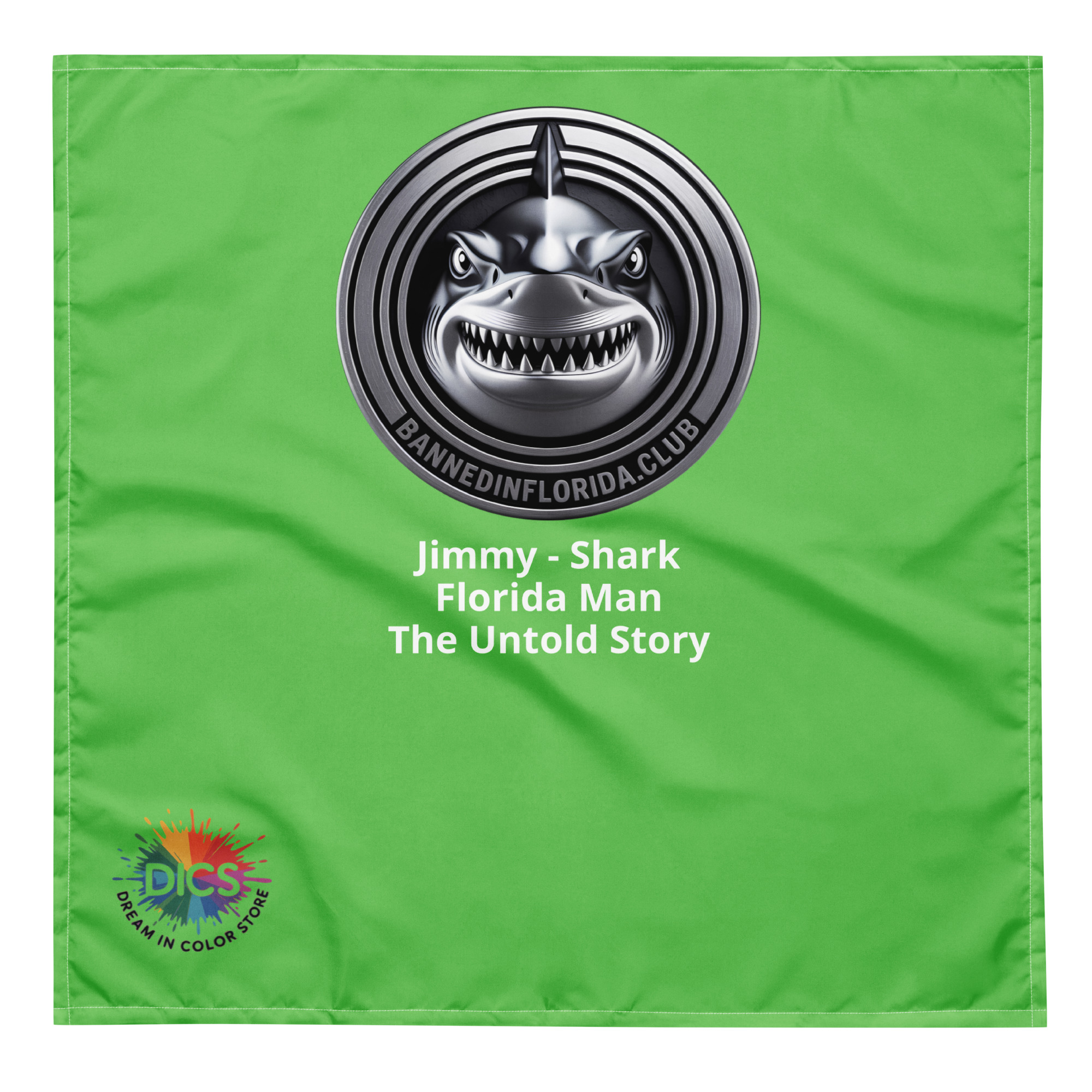 Jimmy doesn’t circle — he strikes. The Everglades Division’s most unpredictable operative, Jimmy the Shark owns the waters and the narrative. Behind every wild Florida Man headline is a story the mainstream media won’t tell — a state government that defunds mental health services, guts social safety nets, slashes education budgets, and then acts shocked when things spiral out of control. Florida Man isn’t a punchline. He’s the result of decades of deliberate policy failure, dressed up in sensational headlines to distract from the people who created the conditions in the first place. Jimmy knows the untold story. He lived it. Now you can wear it. This electric green all-over-print bandana features Jimmy’s silver coin medallion and his cause: Florida Man — The Untold Story. Soft, durable, and built to make people stop and ask questions. $22. bannedflorida.club. Pick your operative.