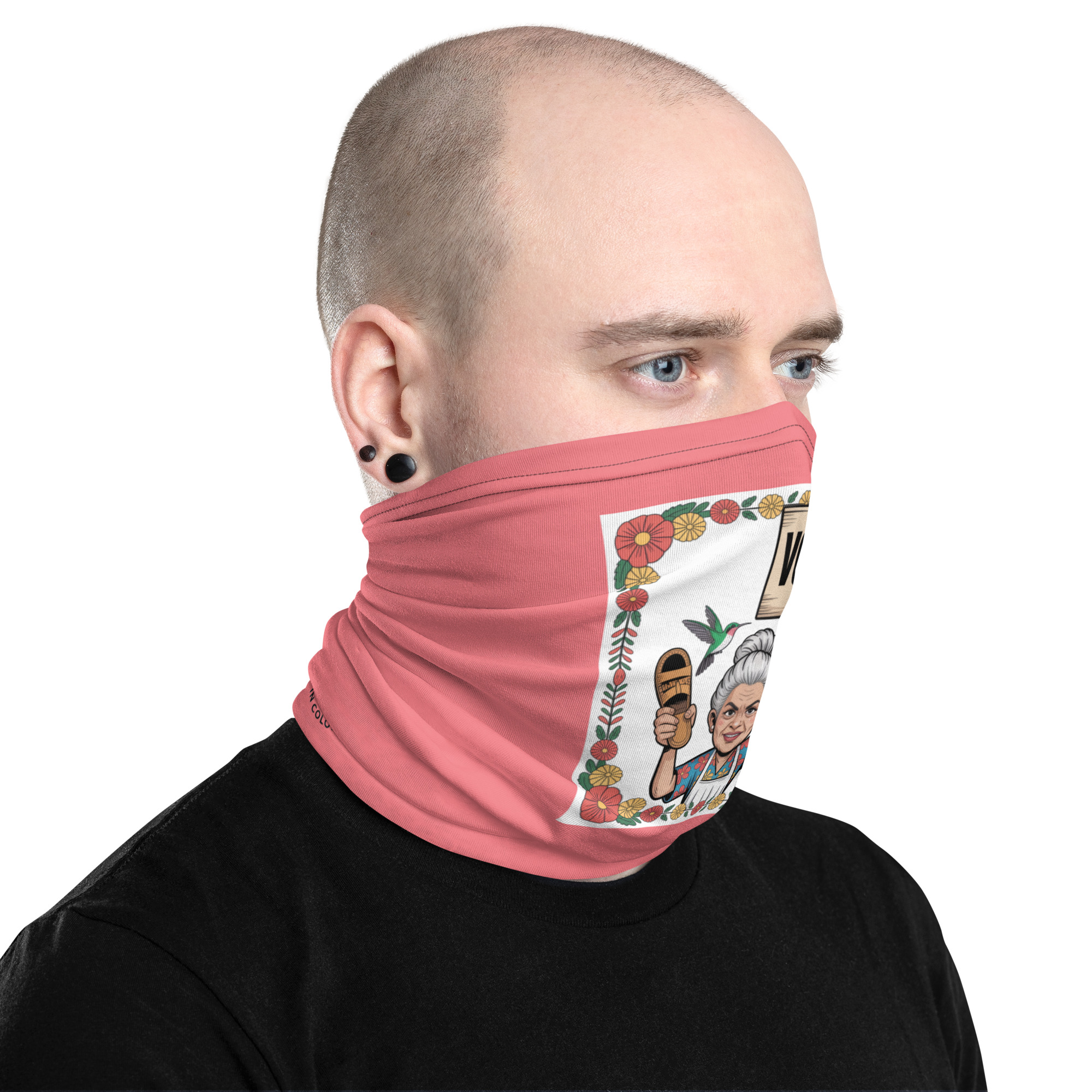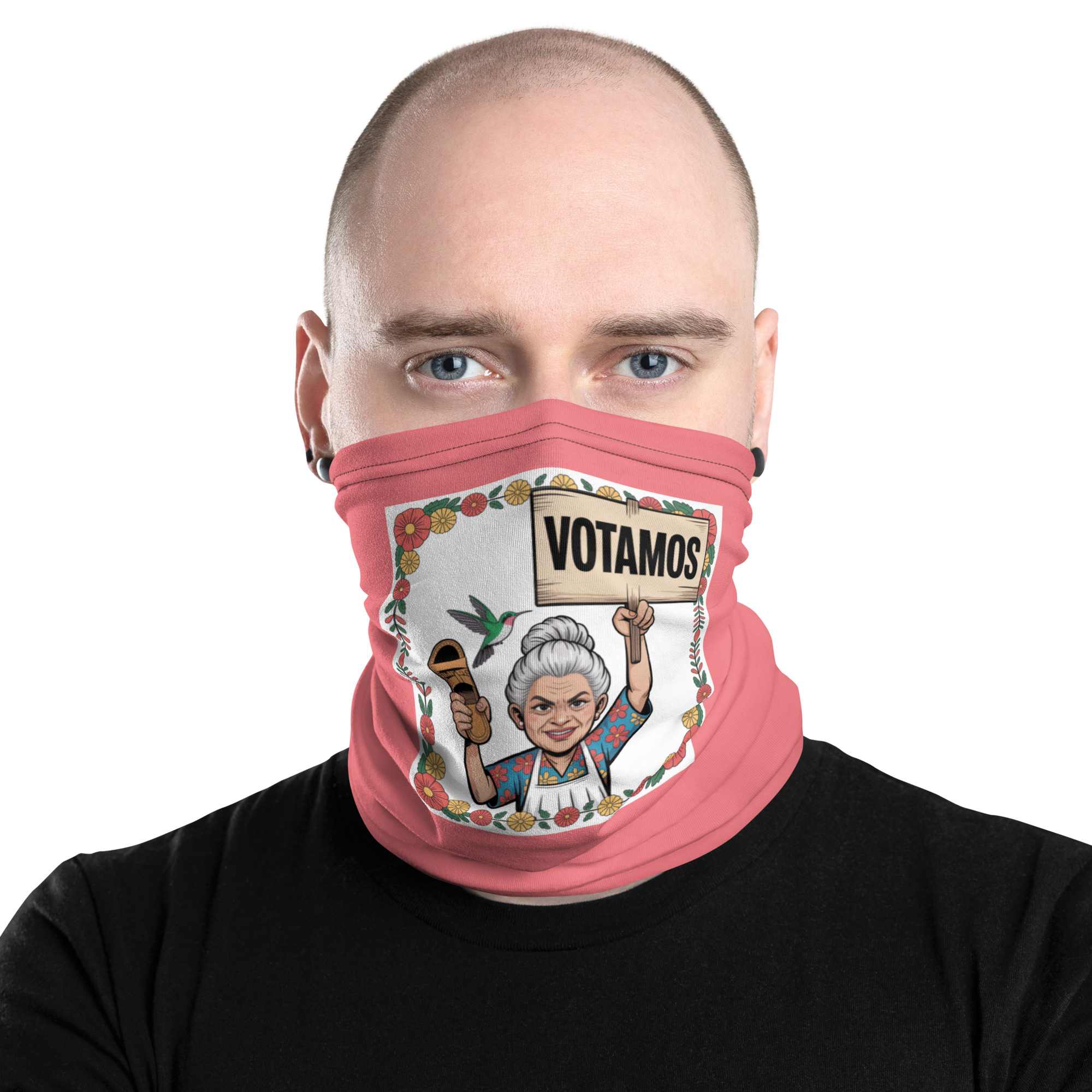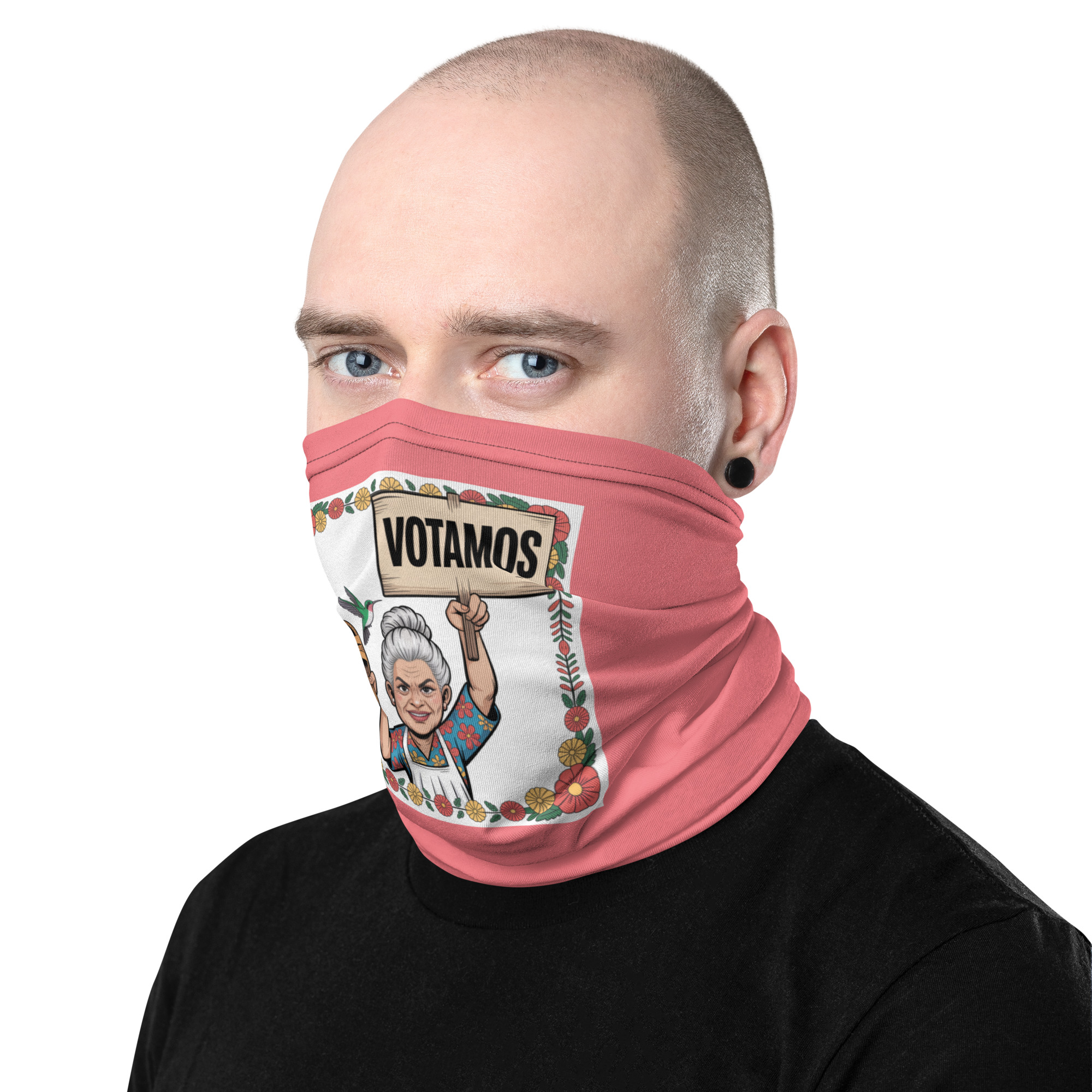 Premium neck gaiter. La Abuela Votamos design on warm rose. Soft, stretchy, breathable. Machine washable.