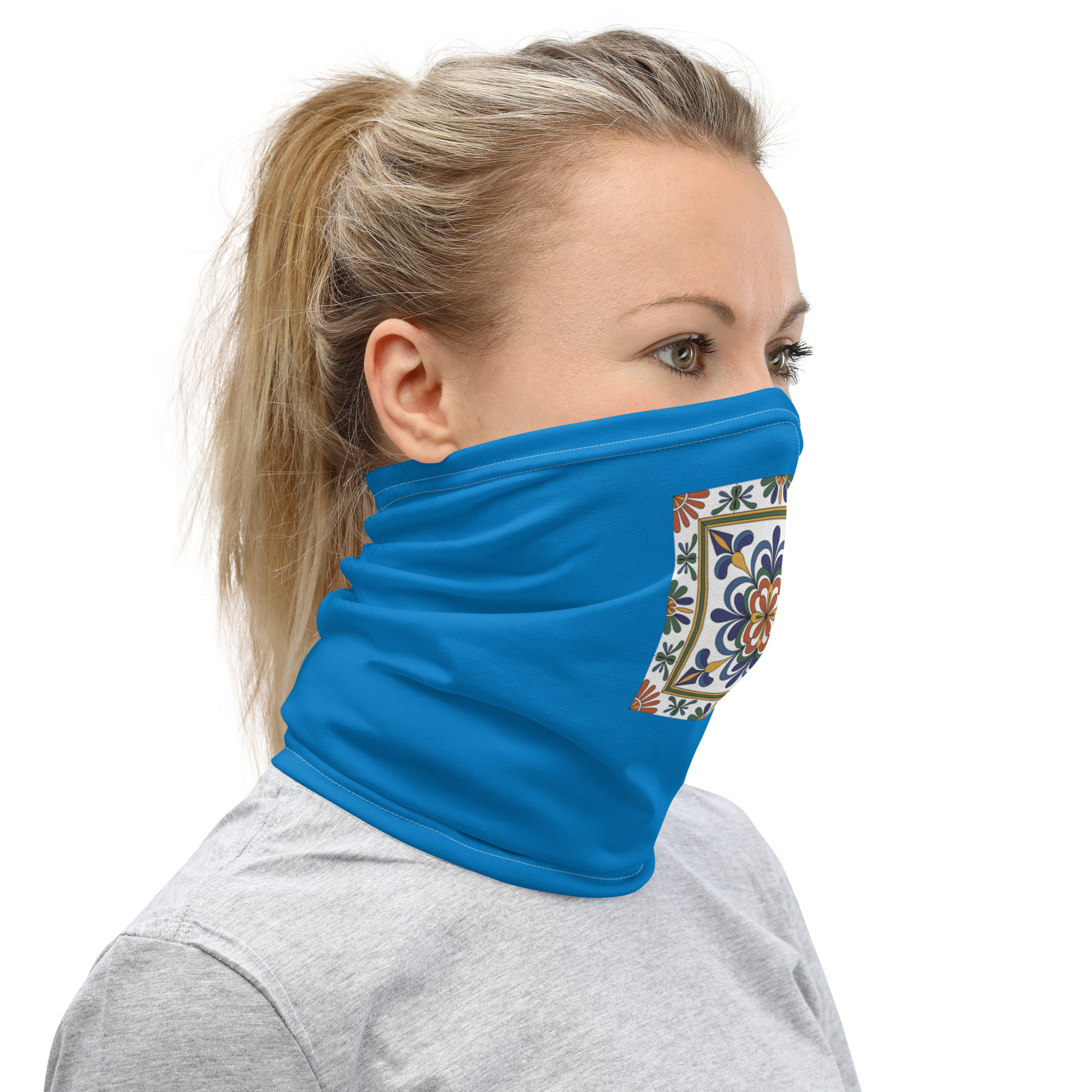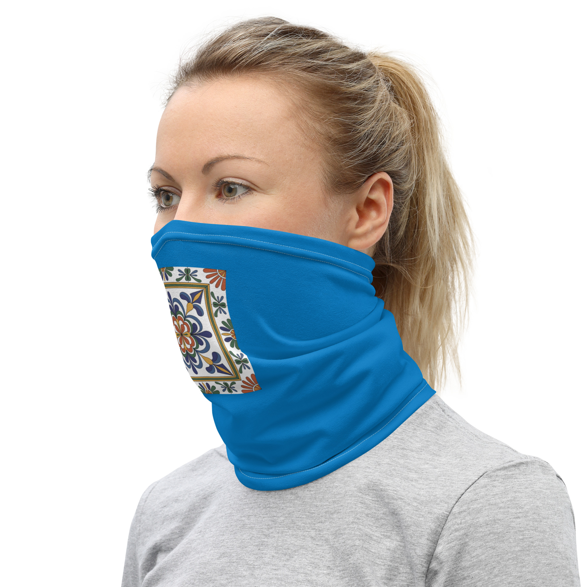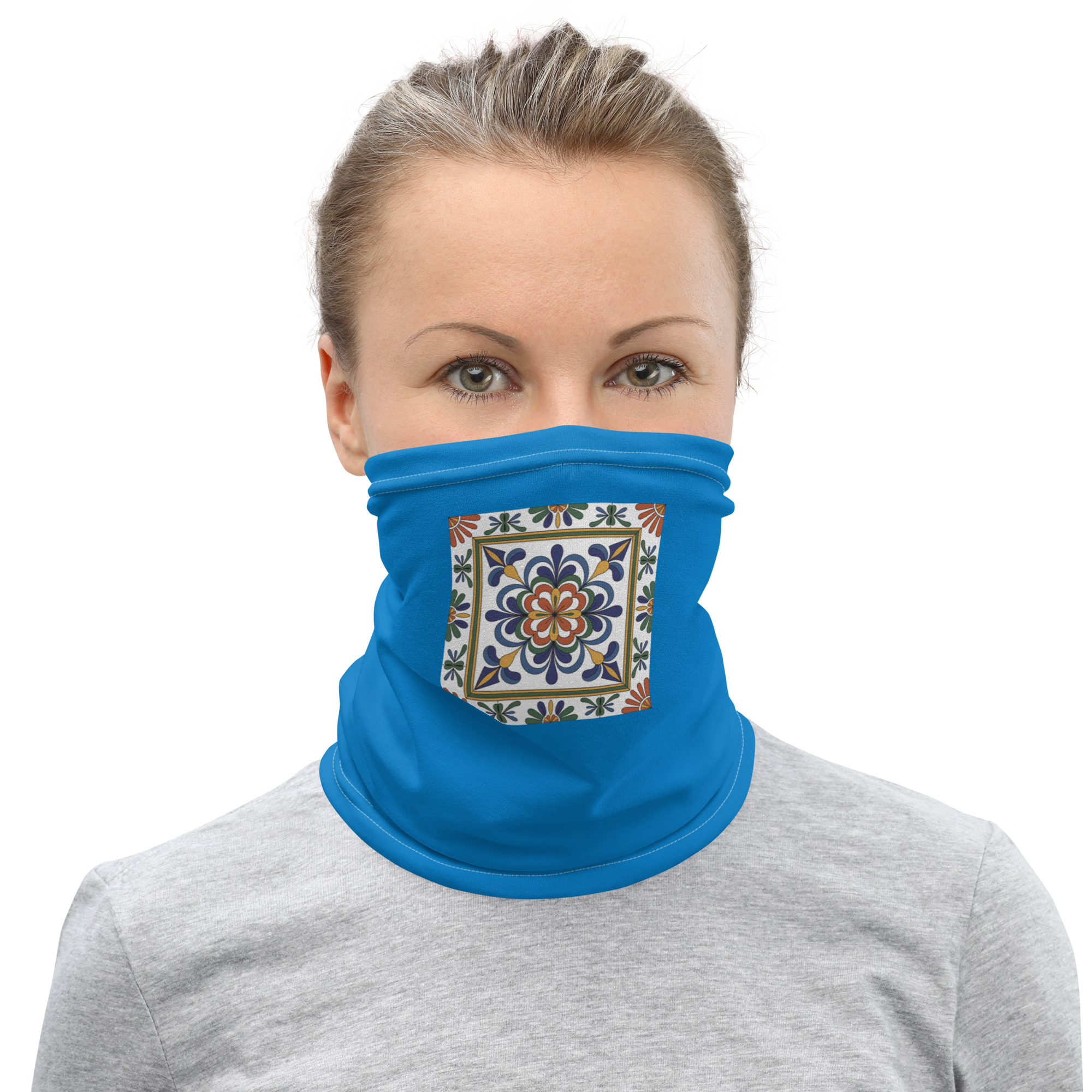 Premium neck gaiter. Vivid geometric Talavera design. Soft, stretchy, breathable. Machine washable.