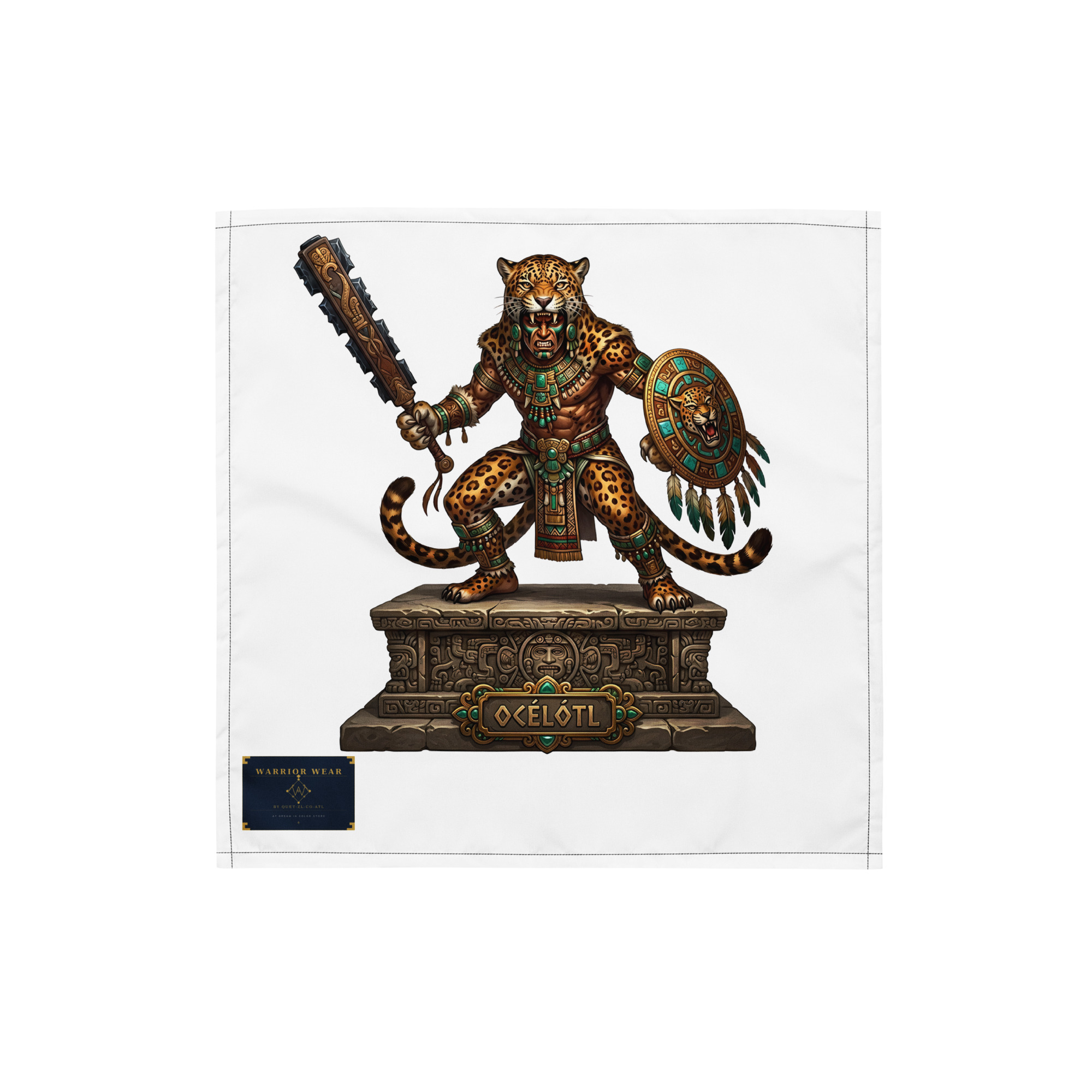 This bandana features original artwork depicting Océlótl in full warrior regalia: spotted jaguar pelt battle suit, jade and gold ceremonial armor, obsidian macuahuitl war club raised, and the jaguar shield held with absolute authority. The detail is extraordinary — every glyph, every stone, every feather is rendered with reverence for the tradition it represents.
