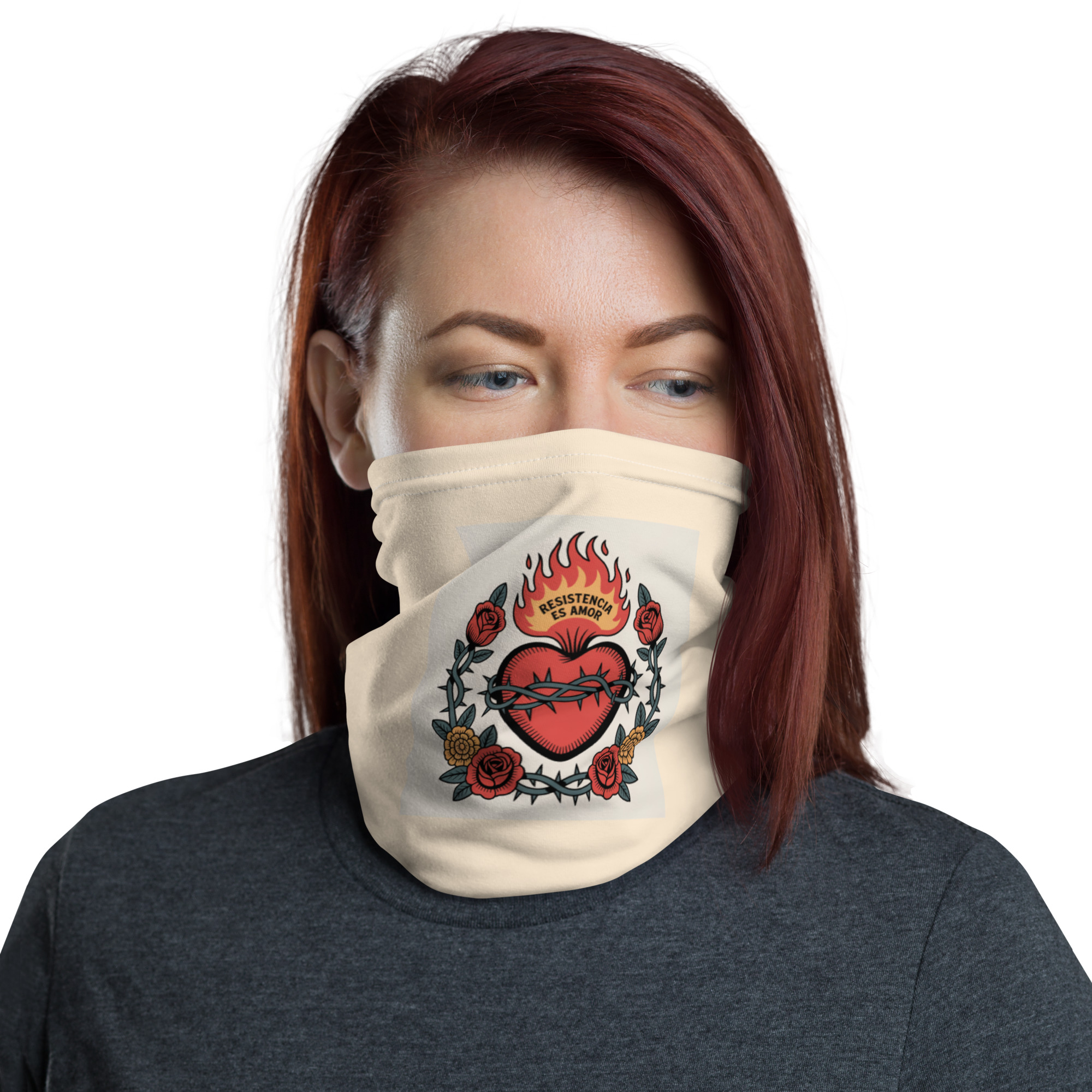 Premium neck gaiter. Sacred heart design on cream. Soft, stretchy, breathable. Machine washable.