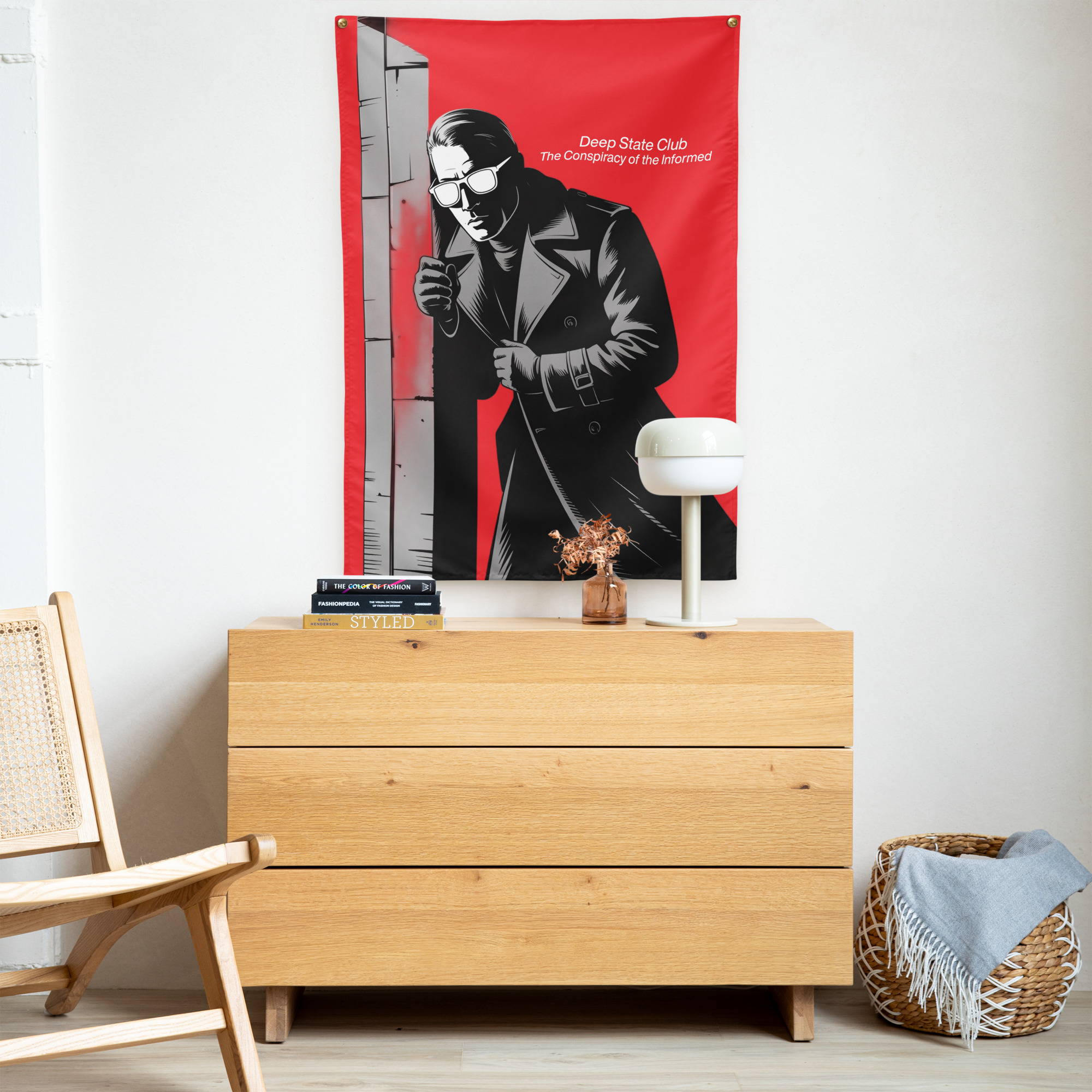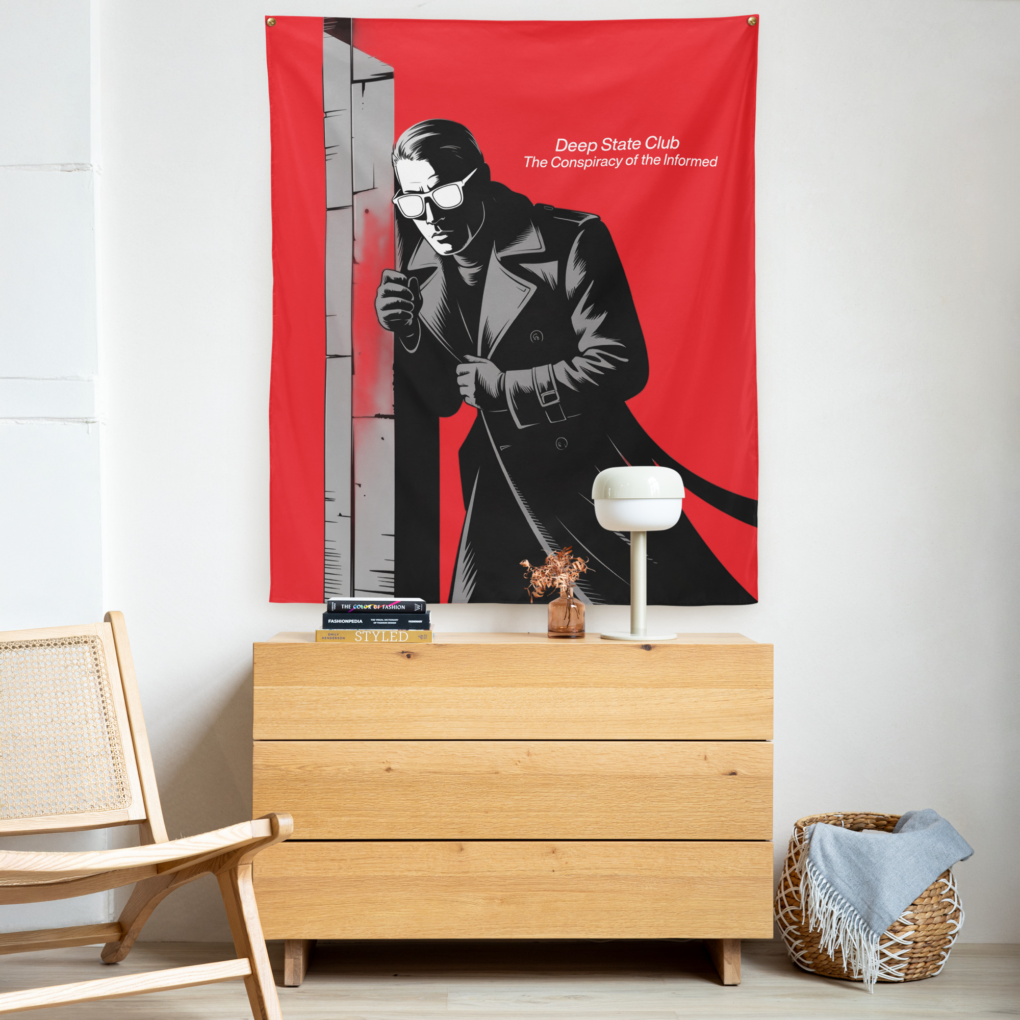 Every doorway is a decision. Victor Shade has made his. The Informed Man crouches in the threshold — ready, watchful, certain. Deep State Club graphic novel wall art for the deeply informed. 100% polyester, vibrant print, two sizes