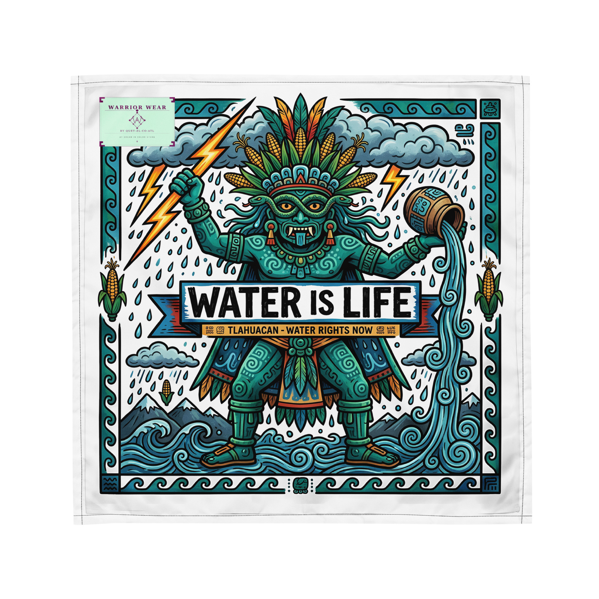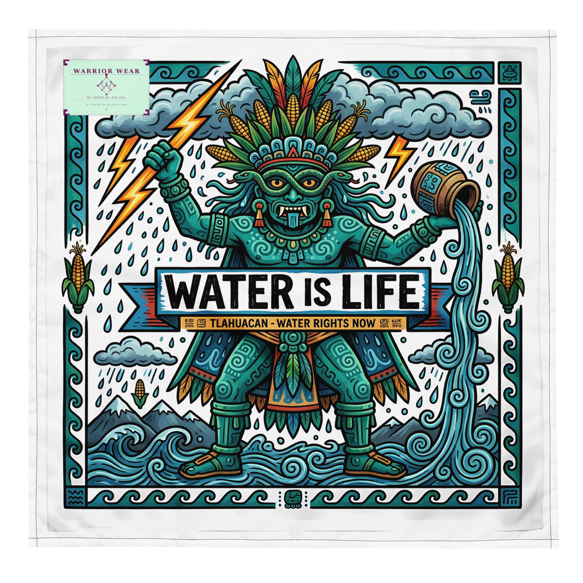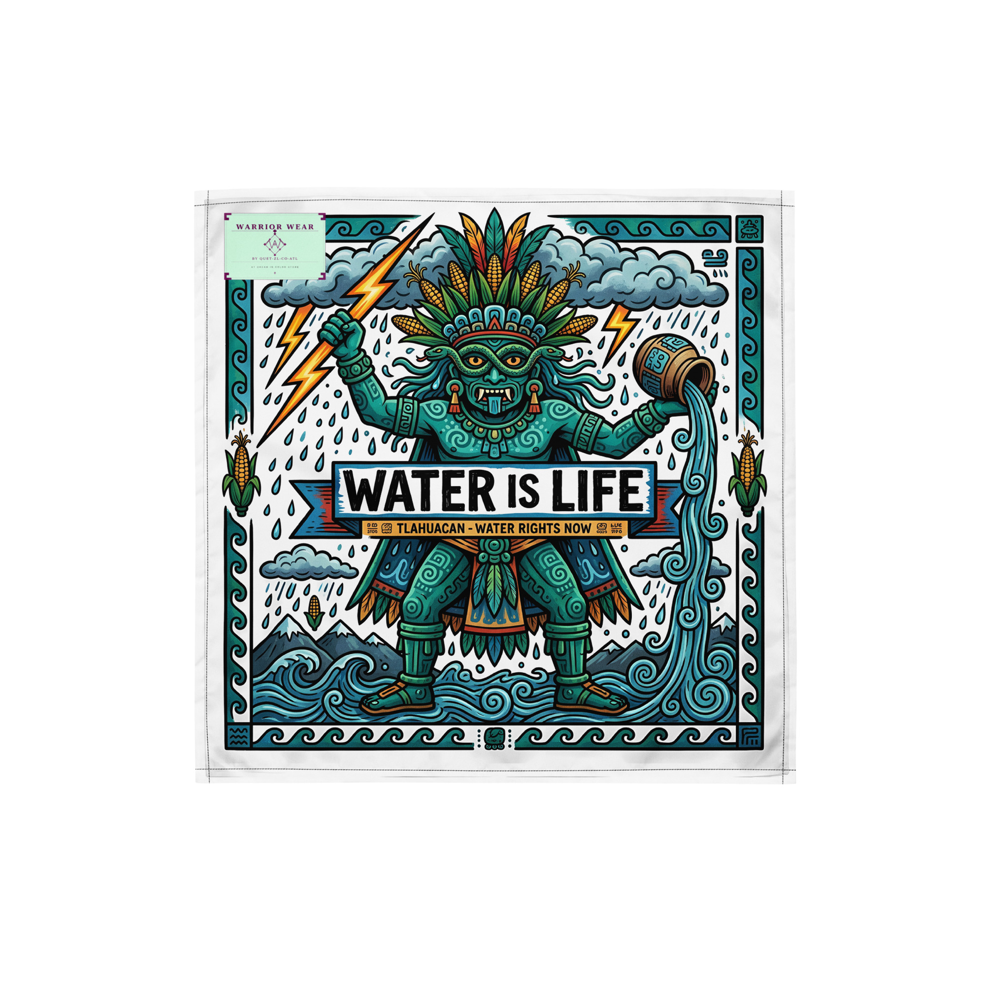 This protest bandana pairs Tlāloc’s ancient authority with a message that has never been more urgent. Clean water is not a privilege. Poisoned rivers are not acceptable. The god who commands the rain is demanding accountability — and so are we.